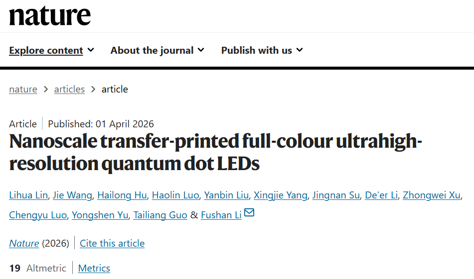 近日,福州大学李福山教授团队在国际顶级期刊《Nature》发表全彩色超高分辨率量子点LED(URQLED)重要研究成果,实现9072–25400 PPI超高分辨率、高效率与长寿命突破,为下一代近眼显示与AR/VR技术提供核心方案。福州大学福建省高校测试中心多台高端仪器为该项研究提供关键表征支撑,以精准权威的数据为顶级成果保驾护航。